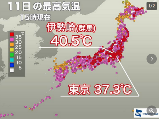 連休明けの今日11日(火)は関東や東北、北陸を中心に体温を上回る酷暑となり、群馬県伊勢崎市など3地点で今年全国で初となる40℃以上を観測しました。 太平洋高気圧の中心が関東付近まで��
