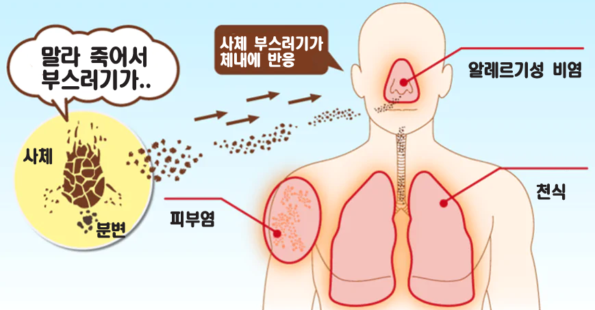 그것이 피부나 호흡기에 붙어 알레르기로 발현되기 때문입니다.