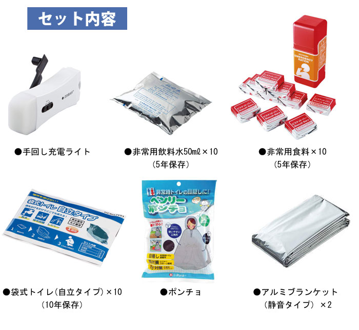 수동충전 라이트, 비상 식수 (50ml × 10), 비상 식량 × 10, 봉투식 화장실 (자립 타입) × 10, 알루미늄 담요 (저소음 타입) × 2, 호루라기, 구급 용품, 케미컬 라이트 × 2, 플라스틱 부채 × 2, 포켓 티슈 × 5