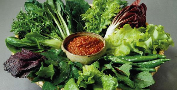 쌈으로 여러 채소 잎을 겹으로 싸서 먹는 사람들이라