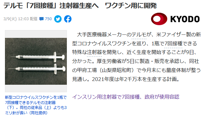 그리고 테루모라는 의료기기제조 회사에서 7회 접종 가능한 주사기를 대량 생산한다고한다.