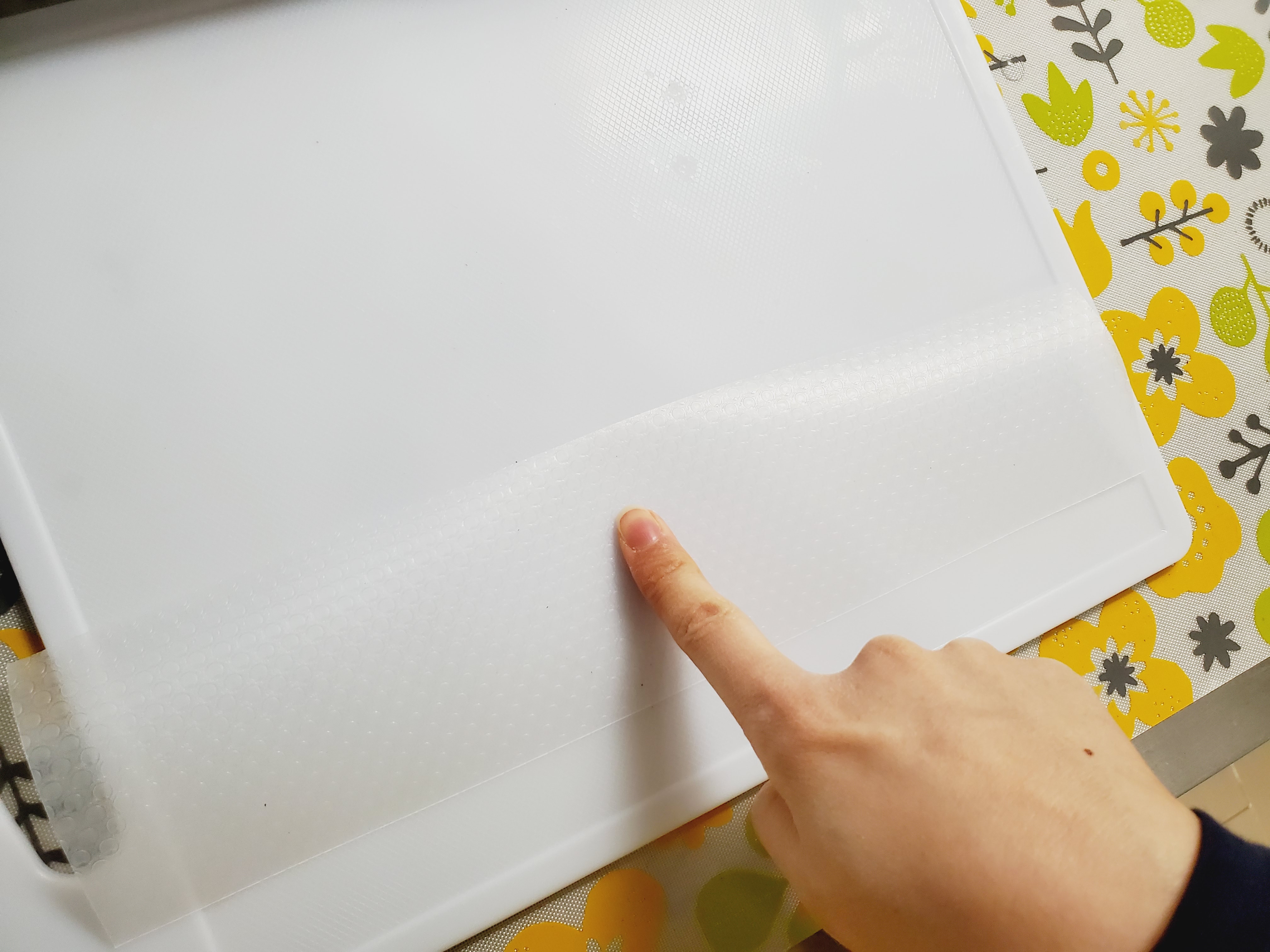겉면의 거친 부분을 아래로 하면 도마 위에서 미끄럼 방지 설계.