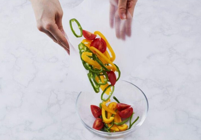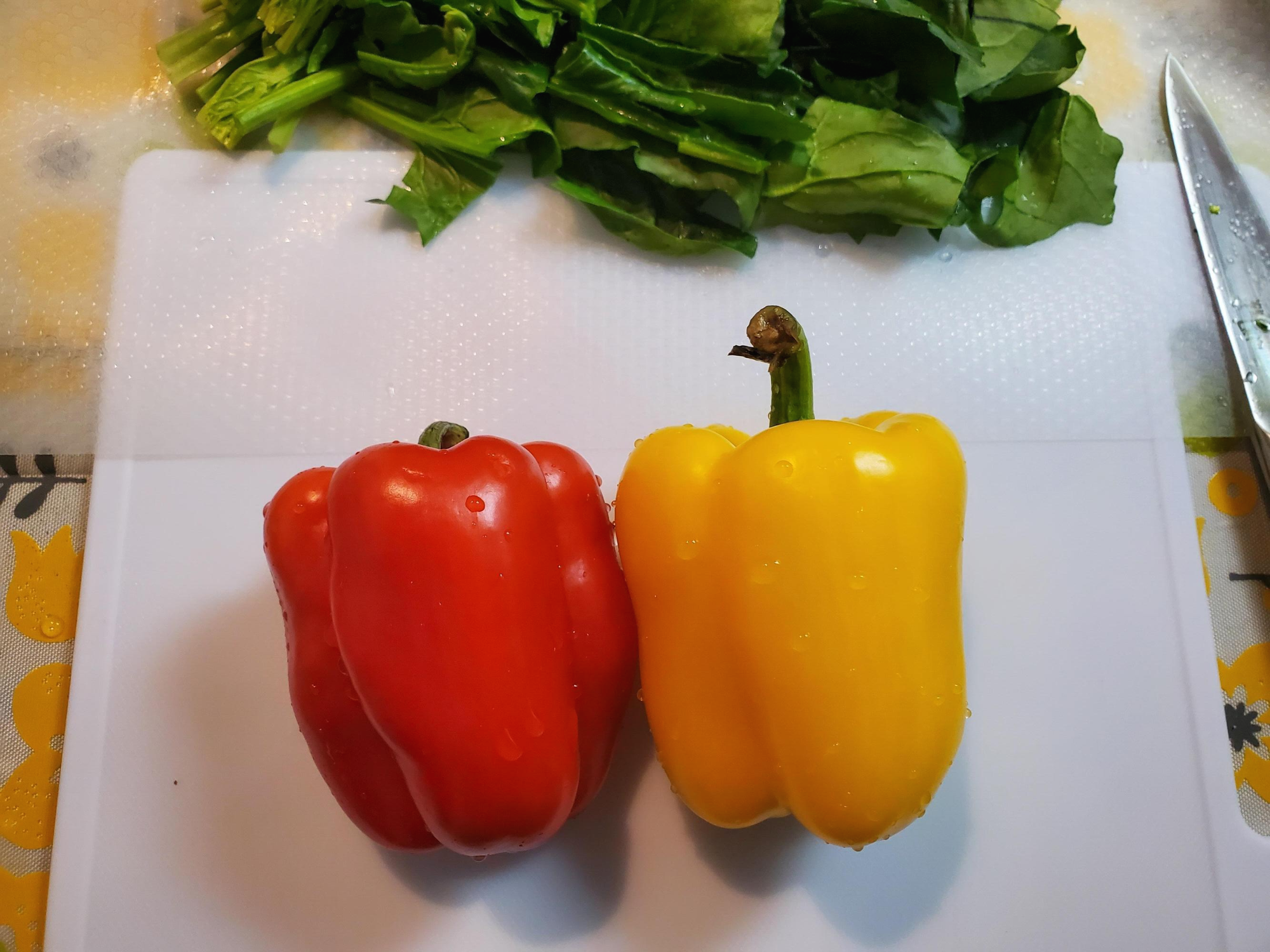 시금치를 자르고 도마 시트 그대로 옮기고서 파프리카를 다시 썰고