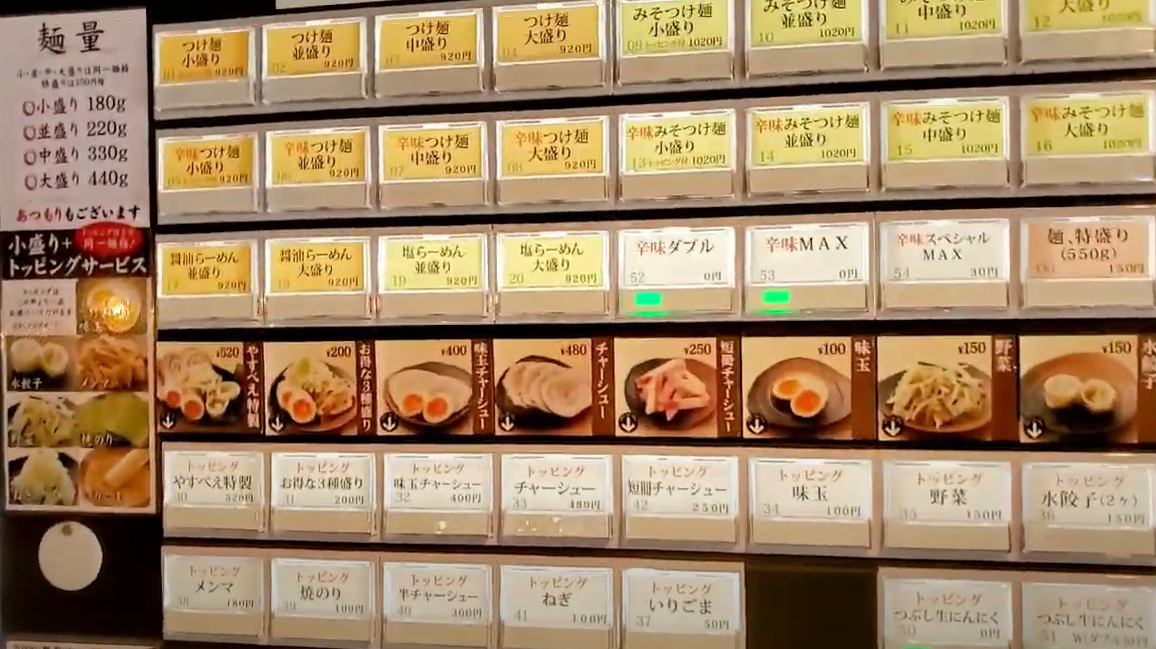 인기가 많은 카라미츠케멘. 920엔에 소자 중자 대자 특대자.
