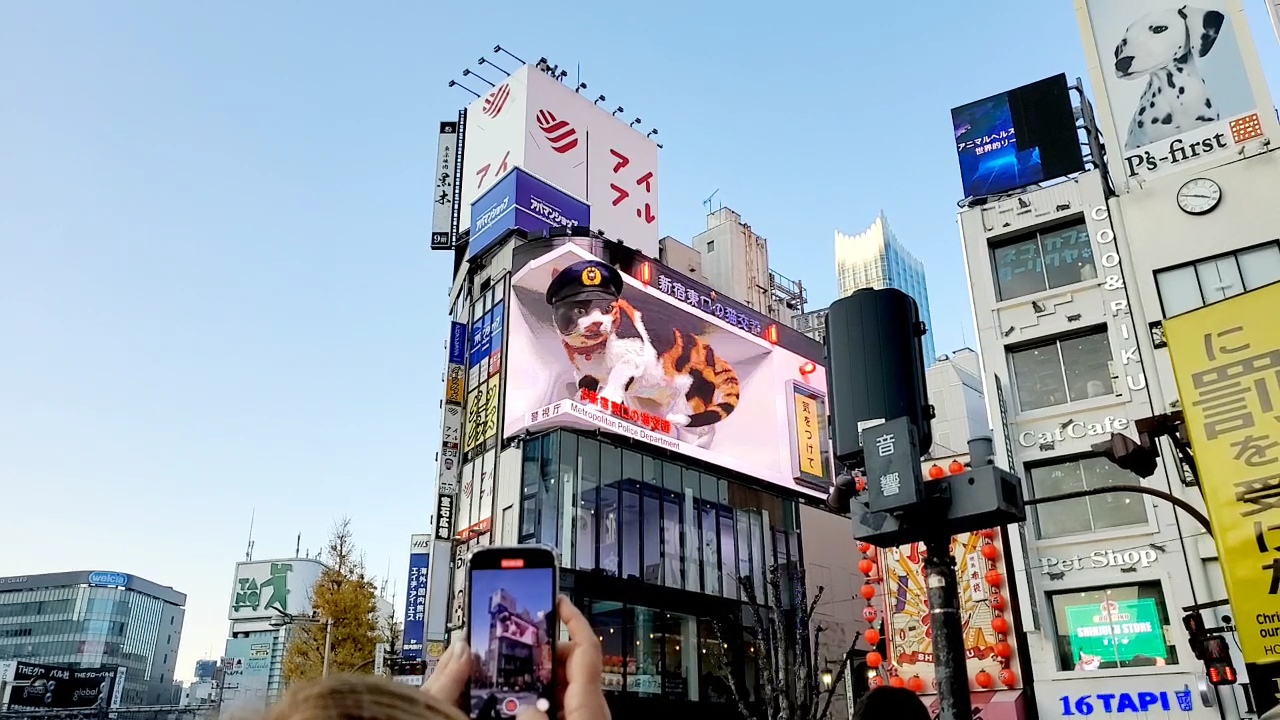 고양이 전광판 앞에는 관광객들이 고양이 찍으려 많이도 몰려 있다.