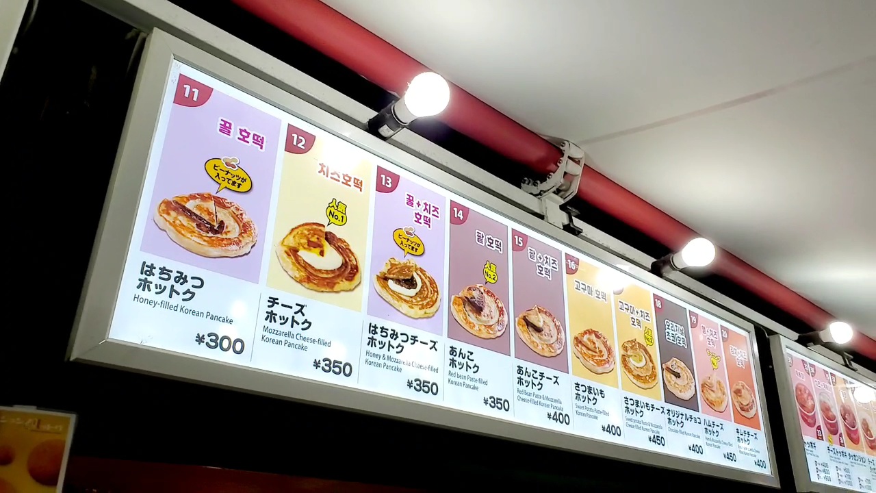 꿀호떡 300엔, 치즈 호떡 350엔, 꿀 치즈 호떡 350엔, 단팥 호떡 350엔 단팥 치즈 호떡 400엔. 초콜릿 호떡 400엔