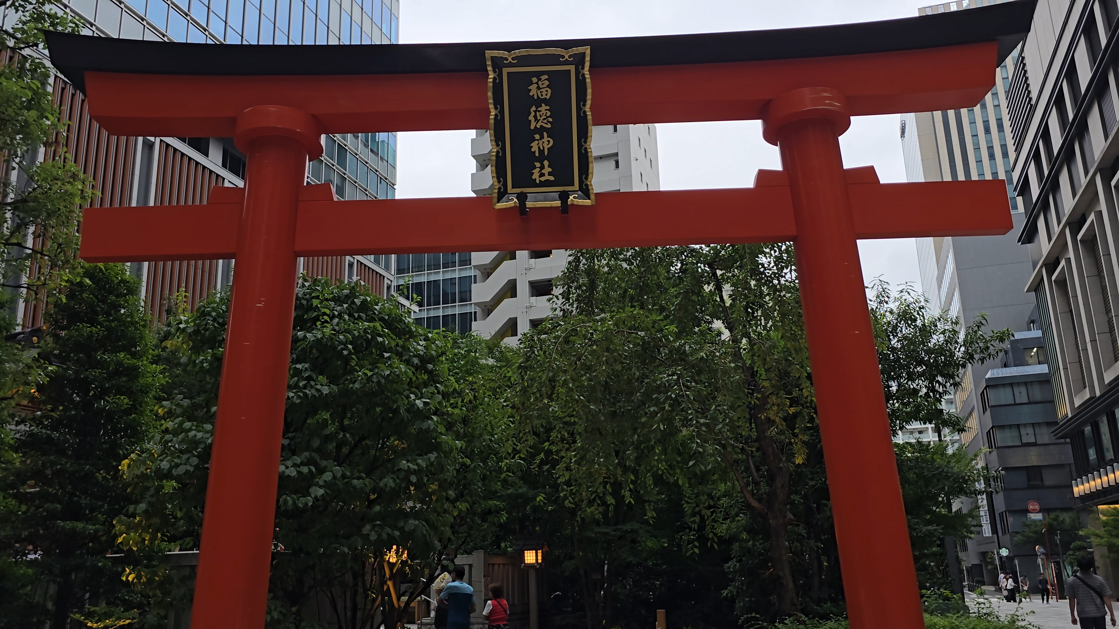 높은 건물로 둘러 싸인 공간에 빨간 도리이.