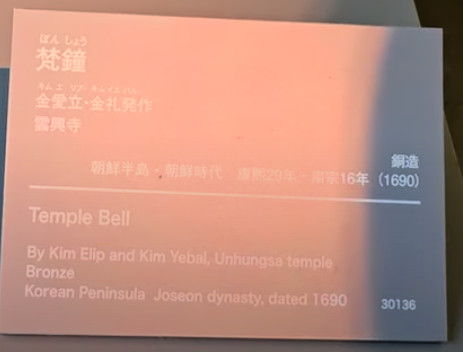 - 유물 설명표의 기록: 미술관 측 설명표에는 '운흥사(雲興寺)', '김애립(金愛立)'이라는 이름이 명시되어 있습니다. 이는 1690년(숙종 16년)에 장인 김애립이 경남 고성 운흥사에서 사용하기 위해 이 종을 만들었음을 증명하는 기록입니다.
