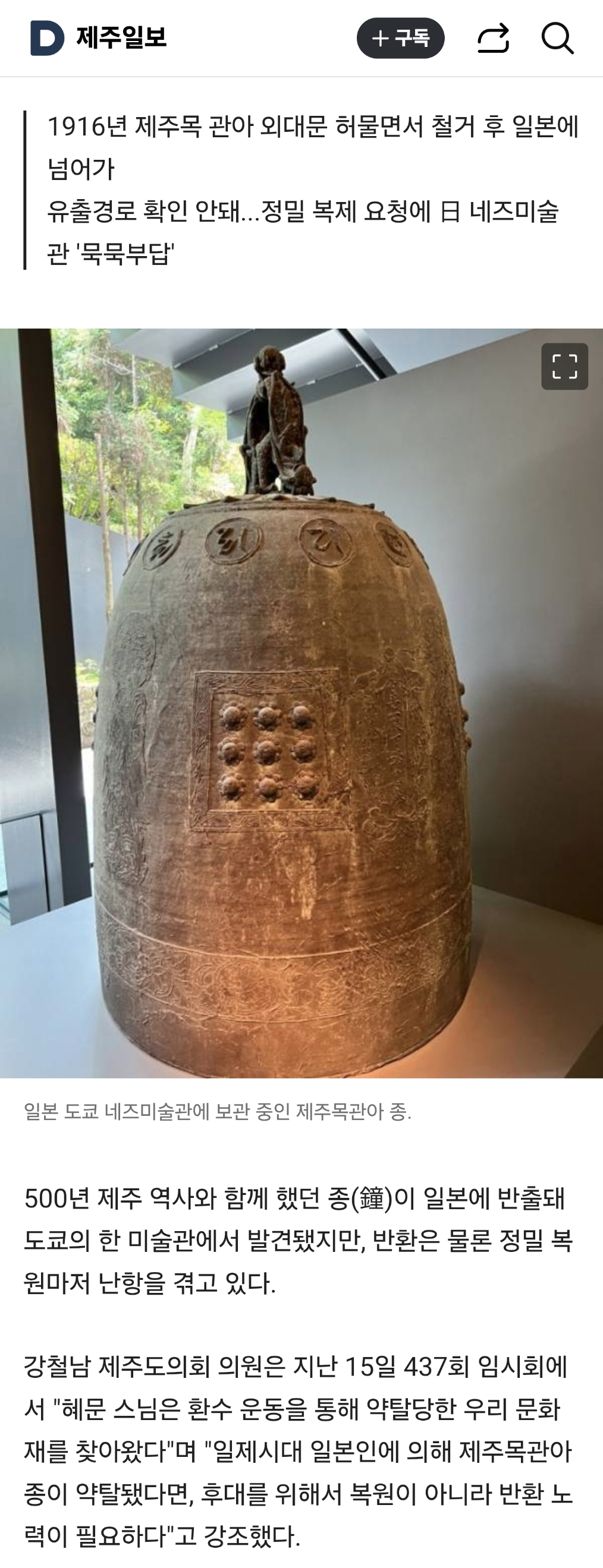 결론적으로, 설명표의 **'운흥사'**는 종이 태어난 고향을 말하고, 기사의 **'제주목 관아'**는 종이 일본으로 끌려가기 전까지 수백 년을 머물렀던 집을 말합니다. 한국의 연구자들은 이 종에 새겨진 특이한 문양과 제작자의 이름, 그리고 1916년 제주에서 종이 사라진 시점을 연결하여 이 종의 정체를 확정 지었습니다.