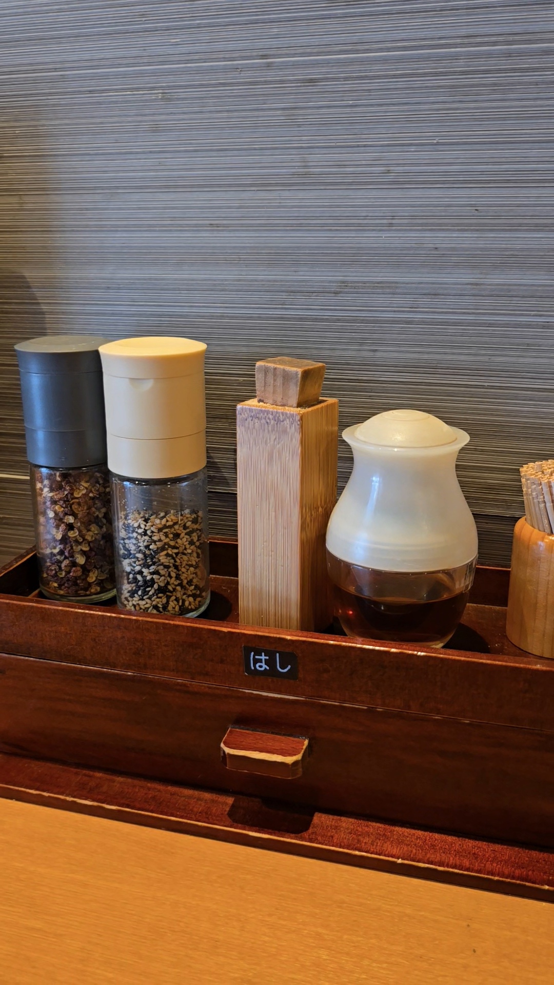 그 위에 소금 후추 식초 등이 올라가 있다.