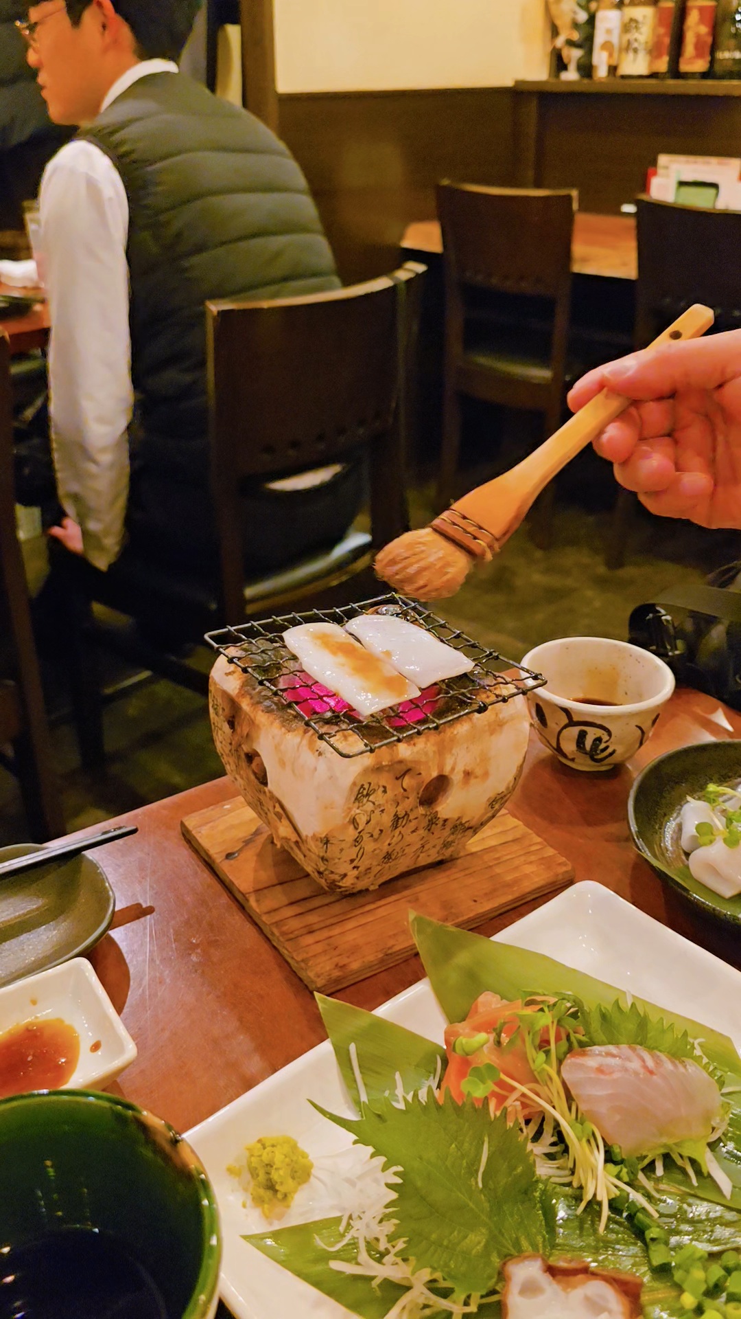 숯불을 올린 시치링에 오징어를 올리고 소스를 발라..