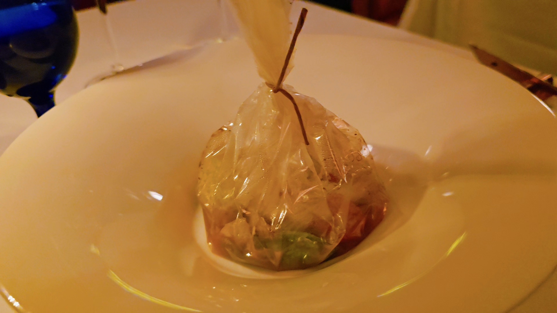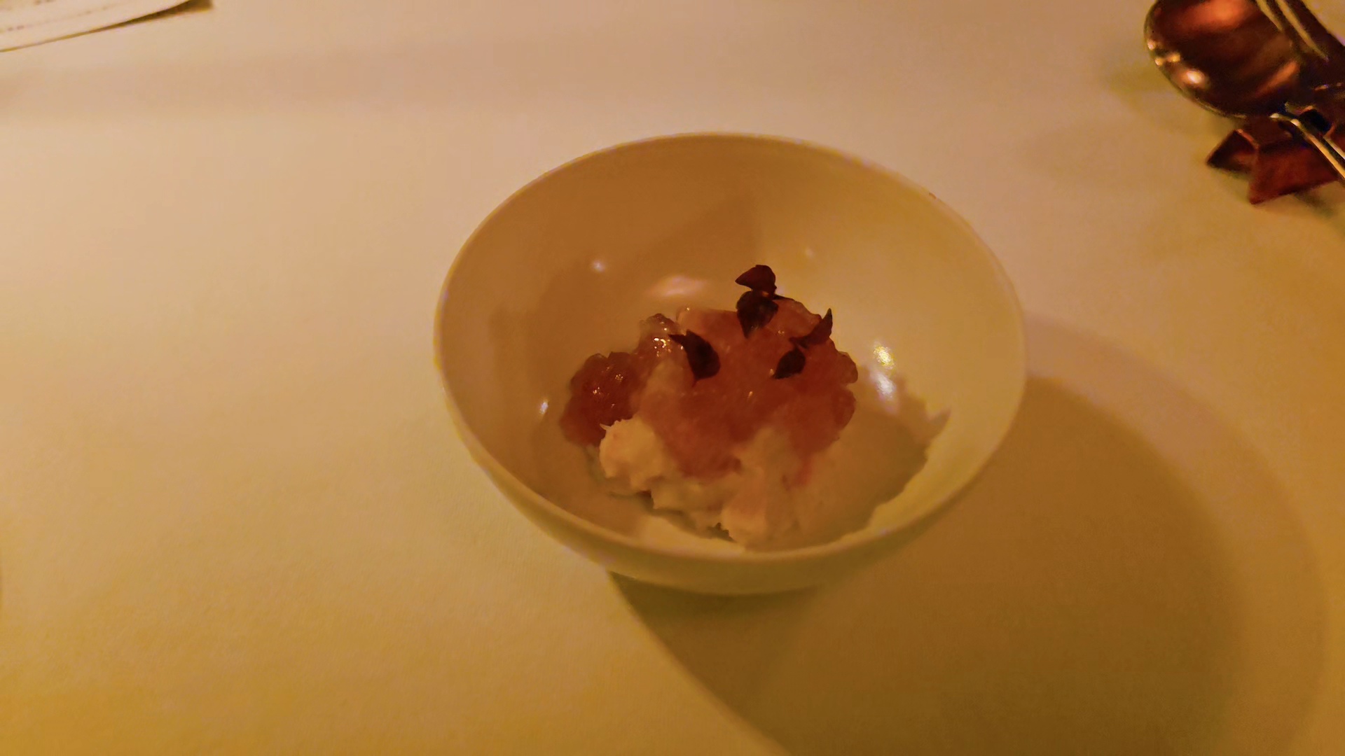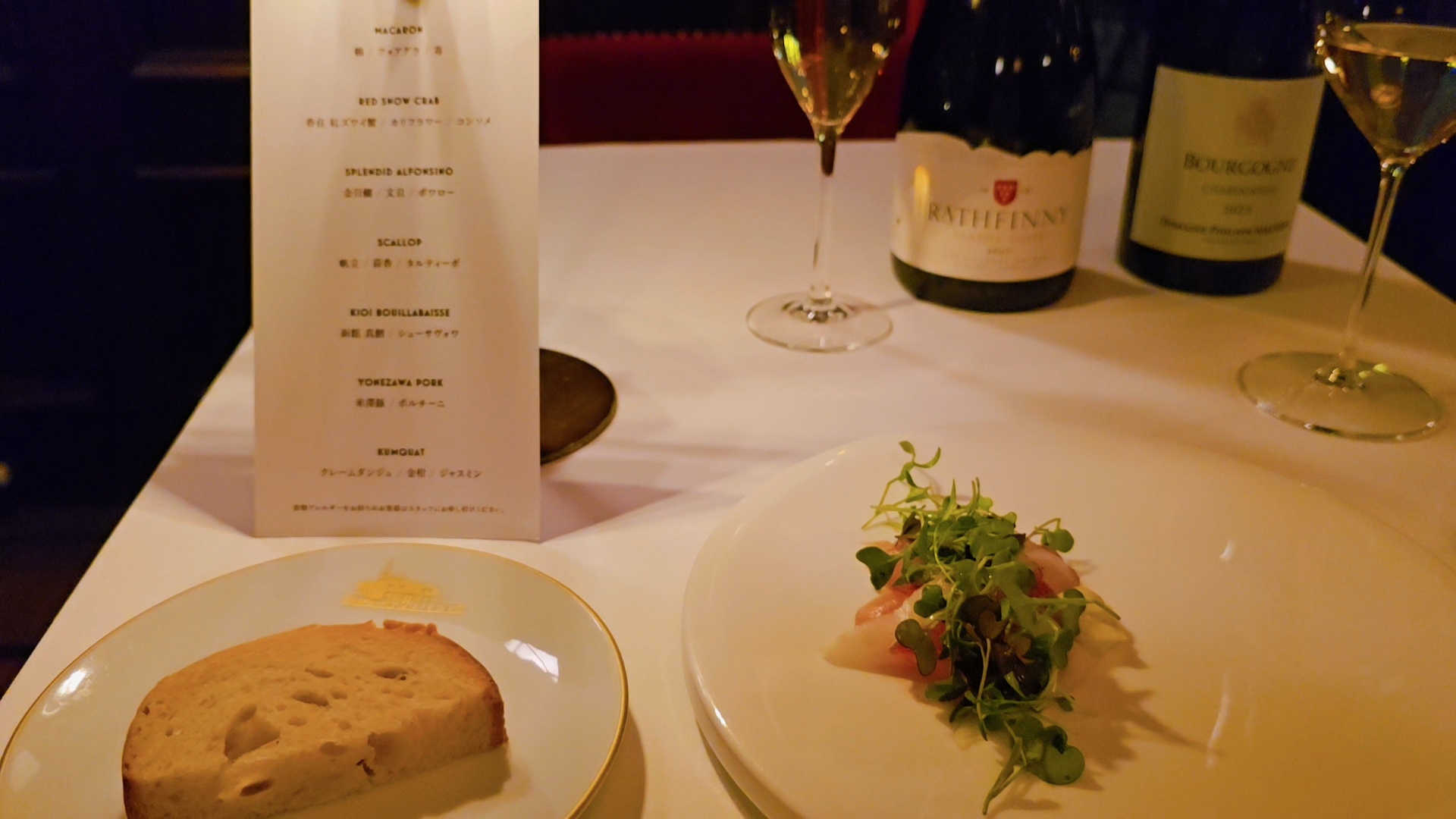 빵이 나오고, 금눈돔 회겸 카르파쵸 같은 느낌의 식사였다.