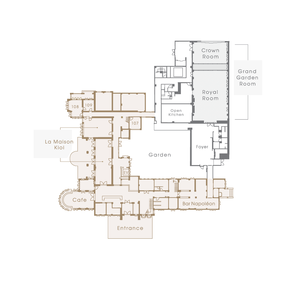 1층에서 가장 넓은 공간은 대식당(大食堂)이다. 준공 당시부터 가장 큰 공간이었던 이 대식당은, 아카사카 프린스 호텔 구관 시절에는 채플로 사용되었다가 지금은 프렌치 레스토랑 '라 메종 키오이(La Maison Kioi)'가 들어서 있다. 천장이 높고 창이 커서 낮에는 빛이 가득 들어온다.