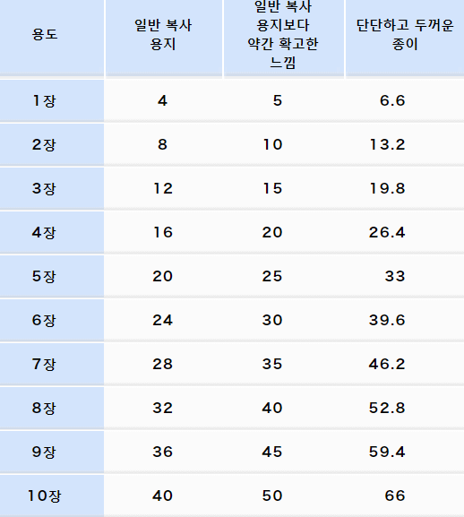 종이의 종류별・매수별로 기준이 되는 무게를 표로 정리했습니다.