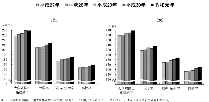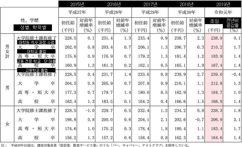 1 学歴別にみた初任給 令和元年の初任給を学歴別にみると、男女計では全ての学歴で、男女別では男性の大学院修士課程修了を除いた全ての学歴で前年を上回っている (第1図 [779KB]、 第1表 [28KB]、 第2図 [170KB]、 付表1 [33KB])。 男女計 大学院修士課程修了 238.9千円 (対前年増減率 0.1%) 大学卒 210.2千円 ( 〃 1.7%) 高専・短大卒 183.9千円 ( 〃 1.4%) 高校卒 167.4千円 ( 〃 1.4%) 男性 大学院修士課程修