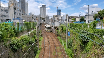 토덴 아라카와선의 트램이 잘 보이는 다리 위에서 찍었다.