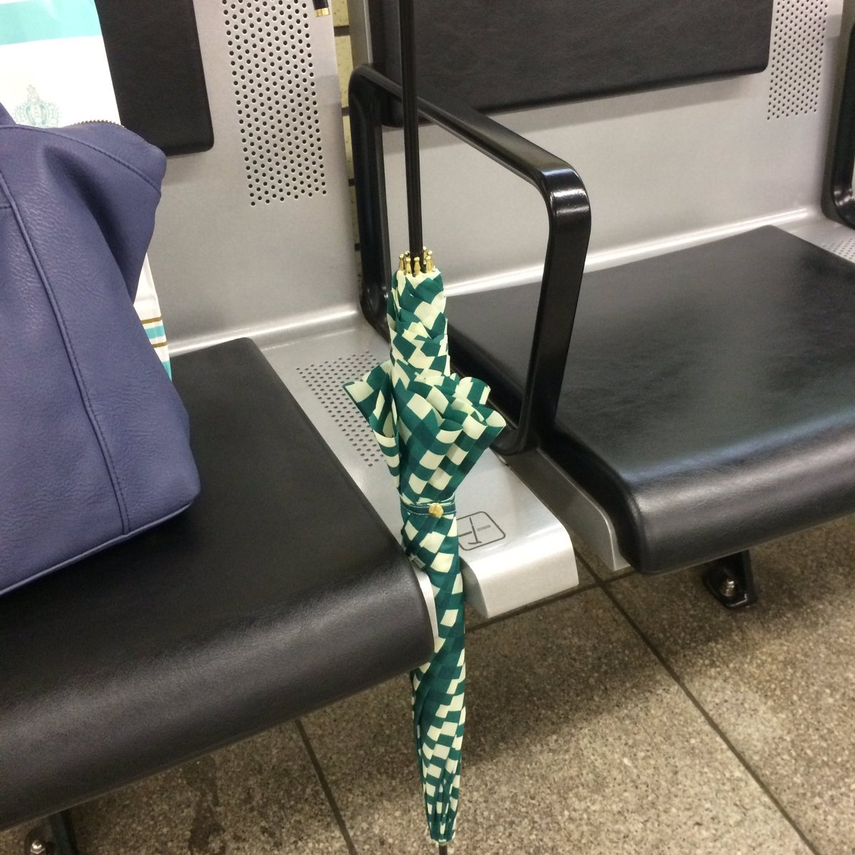 벤치에 걸쳐둔 우산을 옆에 앉으려는 사람이 쓰러뜨렸습니다.