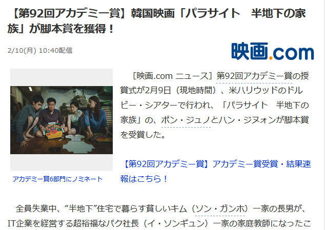 【第92回アカデミー賞】韓国映画「パラサイト 半地下の家族」が脚本賞を獲得!(映画.com) - Yahoo!ニュース