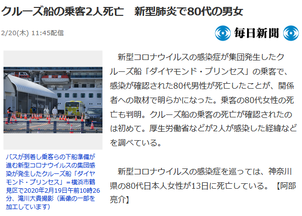 신종 코로나 바이러스 감염이 집단 발생한 여객선 "다이아몬드 프린세스 '감염이 확인 된 승객 80 대 남성이 사망 한 것으로, 관계자에게의 취재로 밝혀졌다. 80 대 여성 승객의 사망도 밝혀졌다.