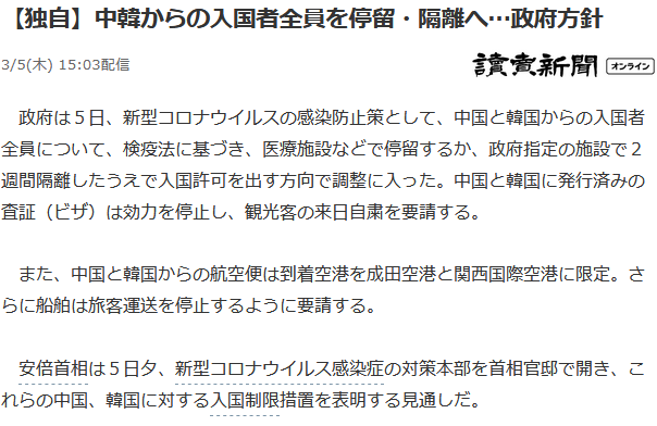 일본 정부는 5 일 신종 코로나 바이러스 감염 방지책으로 중국과 한국에서의 입국자 전원에 대해 검역 법에 따라 의료 시설 등에서 정류 하거나 정부가 지정한 시설에서 2 주간 격리 한 후 입국 허가를 내는 방향으로 조정에 들어갔다.