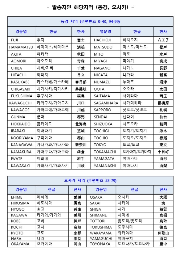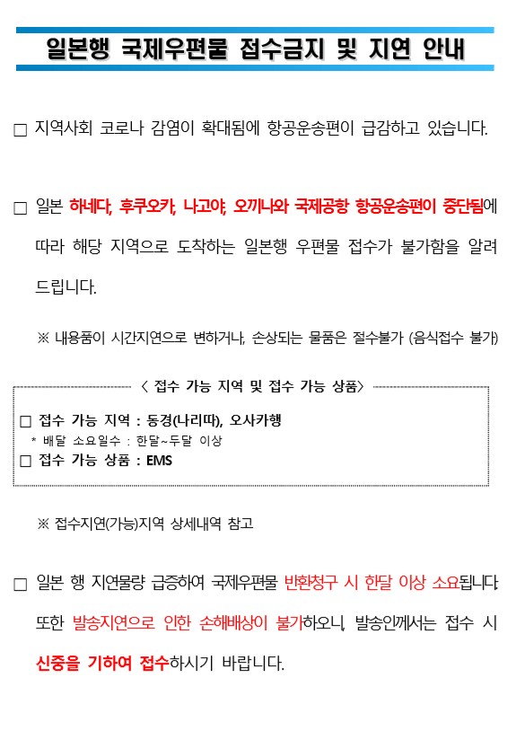ㅇ 내용 : 일본 동경, 오사카 지역외 접수 불가(1달~2달 지연)