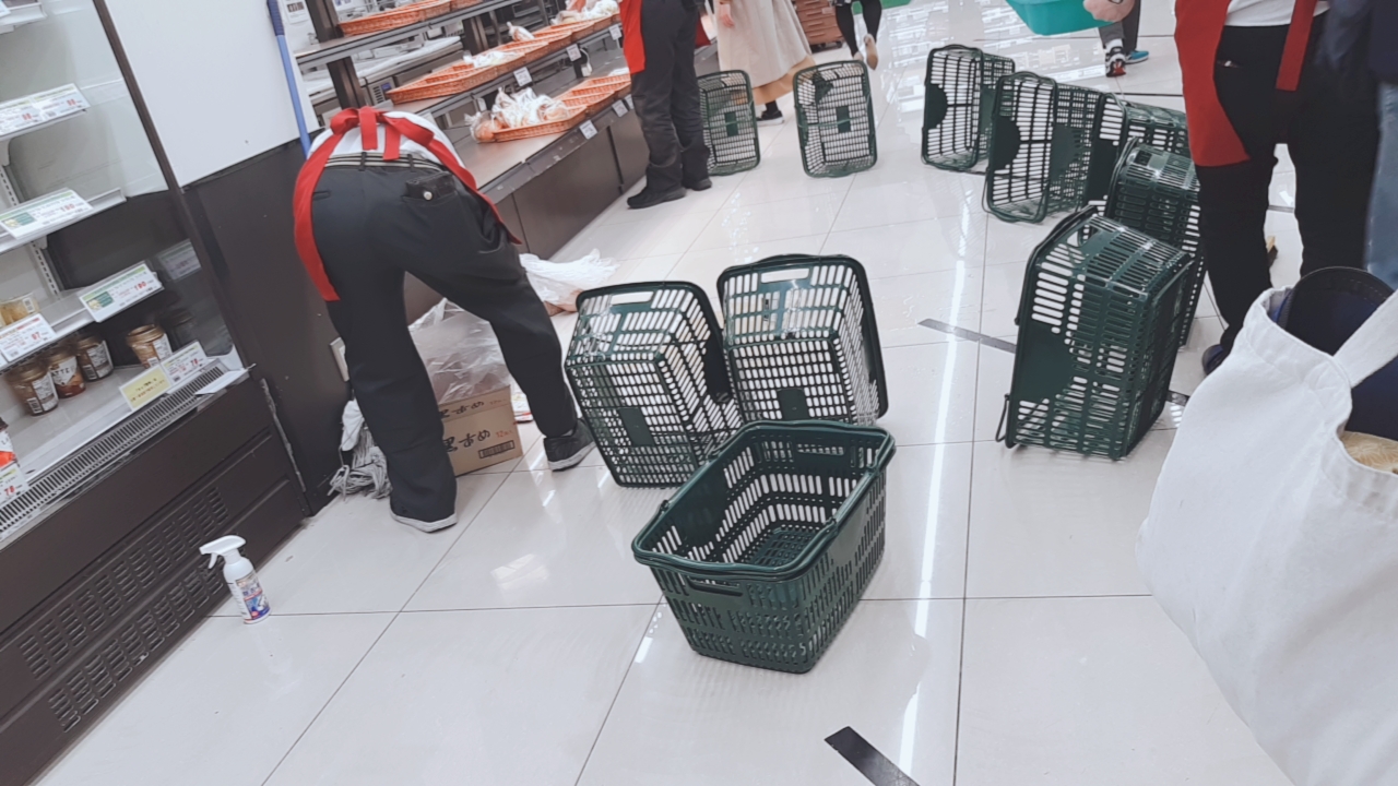 저 장바구니는 고객이 유리 밟을까봐 급한데로 장바구니를 모아 가드를 한것 같다