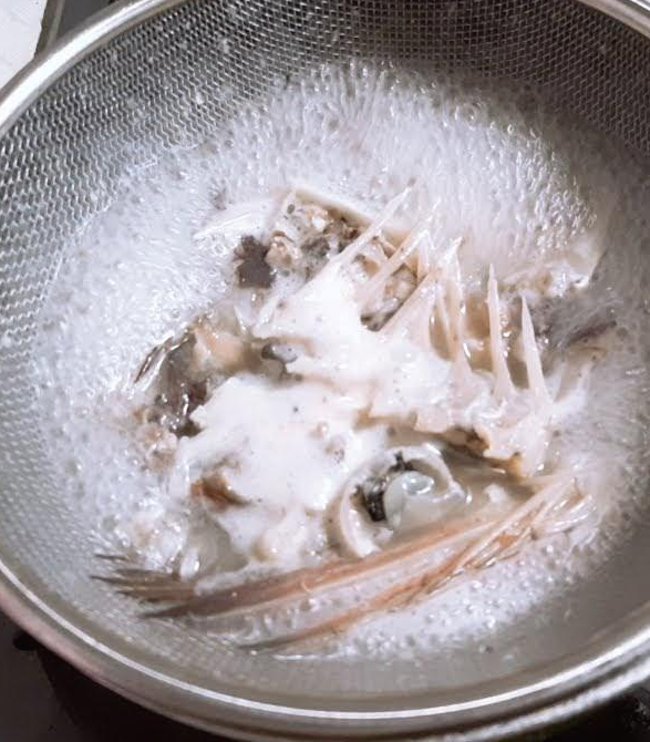 살을 발라낸 물고기 뼈와 머리는 다시 뜰채에 담아 또한번 뼈 국물을 낸다.