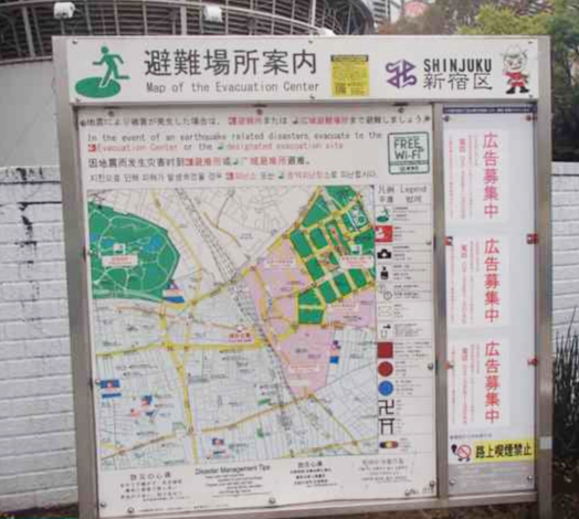 역 밖으로 나오면 바로 보이는 지도는 대부분 피난 장소 안내 표지판.