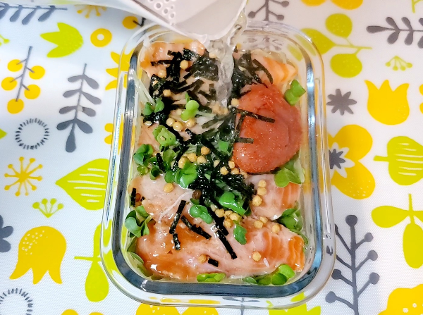맨 아래 밥을 깔고 그 위에 연어를 올리고 멘타이코도 올려서