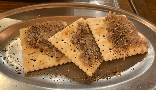 처음 나온 오토오시는 크래커 위에 앙키모 페이스트를 올린 것이다.