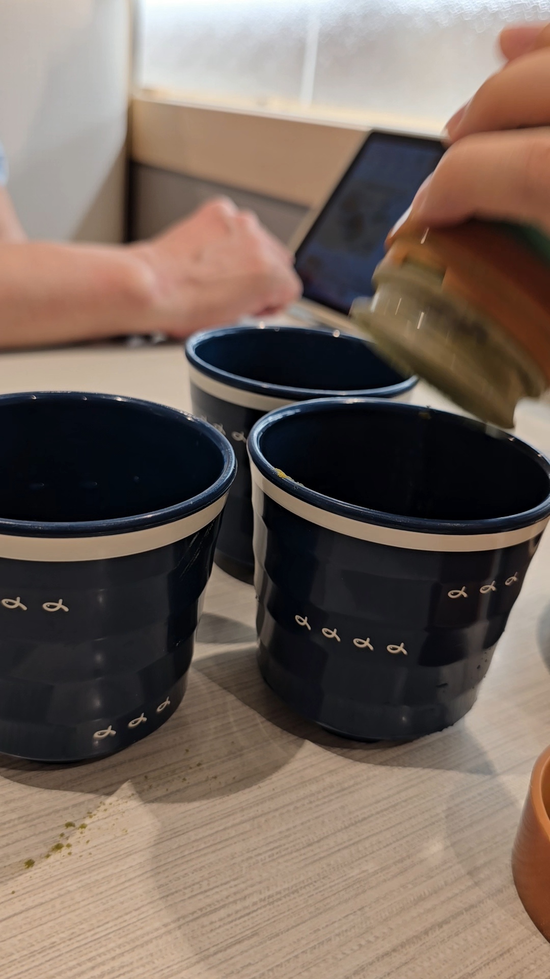 컵을 꺼내서 가루 녹차를 탈탈 털어주고