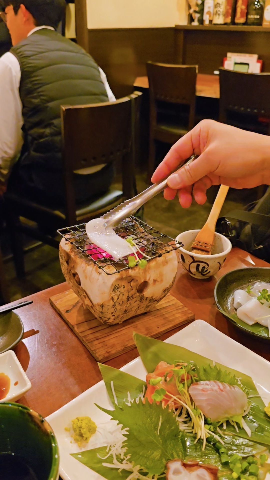 숯불을 올린 시치링에 오징어를 올리고 소스를 발라..