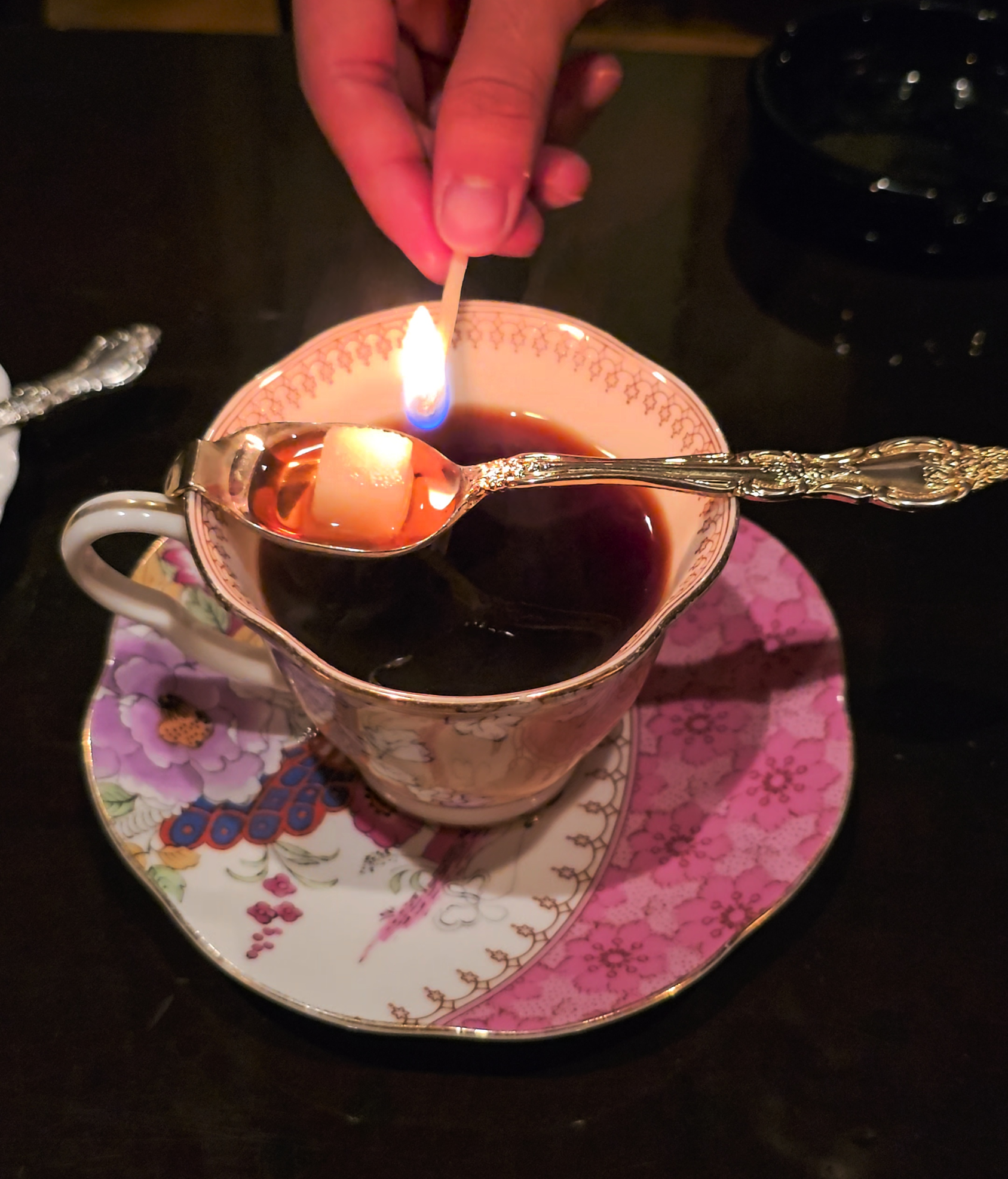푸른 불꽃이 일렁이며 설탕이 녹아내리는 모습은 격식 있는 자리에서 대접받는다는 느낌을 주는 최고의 퍼포먼스.