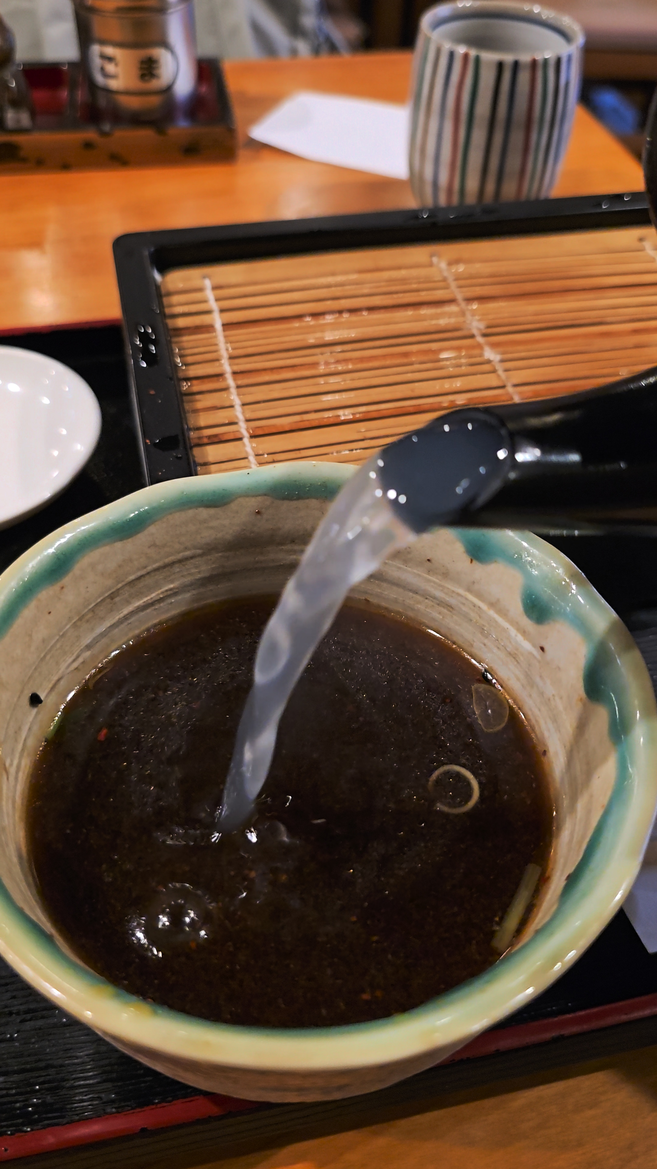 심심한 소바 삶은 물을 츠유에 부어버린다.