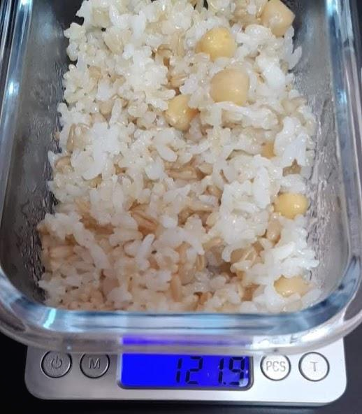 밥을 하고, 도시락 용기 무게를 뺀 저울에